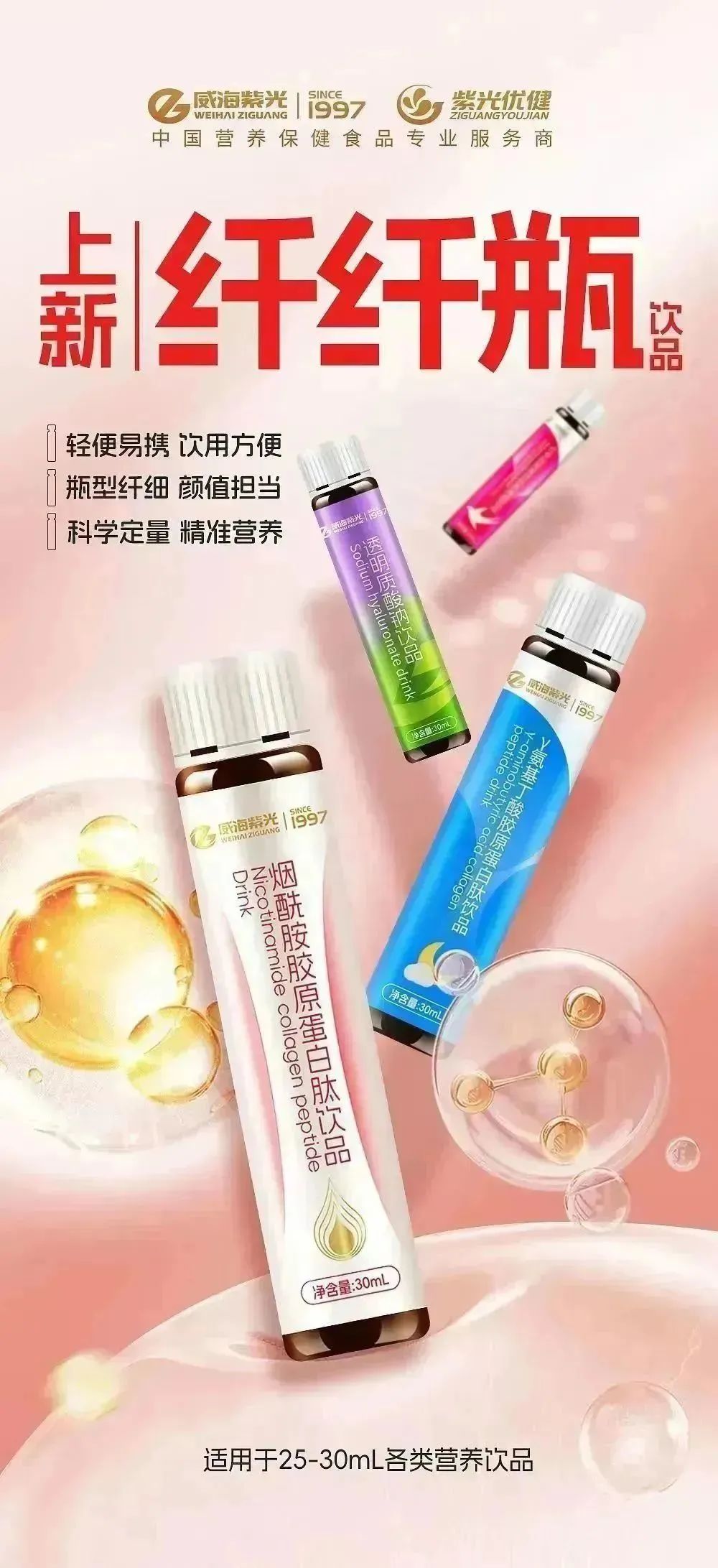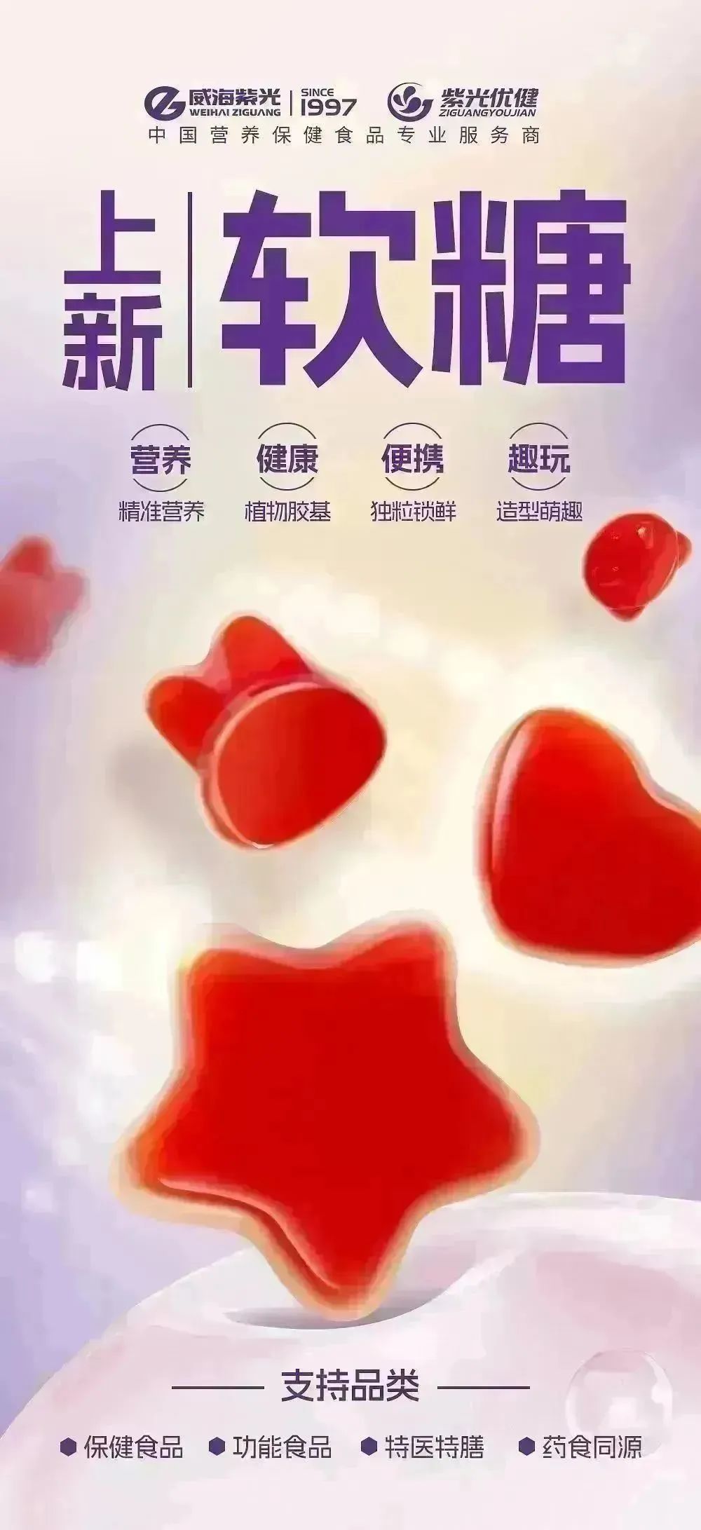 威海紫光致力于提高国民健康水平,推出爆珠、纤纤瓶、软糖等多种迎合市场需求的剂型,建立起覆盖全生命周期的产品链条和产业矩阵。从孕产妇、婴幼儿、青少年、到中青年、中老年,定制专业营养配方,产品满足不同人群全生命周期的营养健康需求,实现均衡营养覆盖。