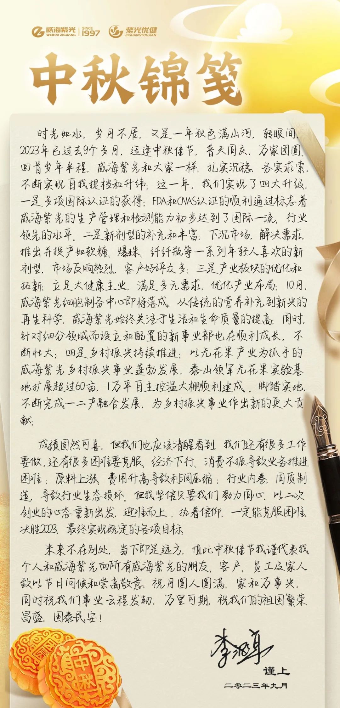 【中秋锦笺】威海紫光董事长李泥亭先生中秋、国庆寄语——祝愿祖国繁荣昌盛,祝各位朋友、客户及家人中秋快乐