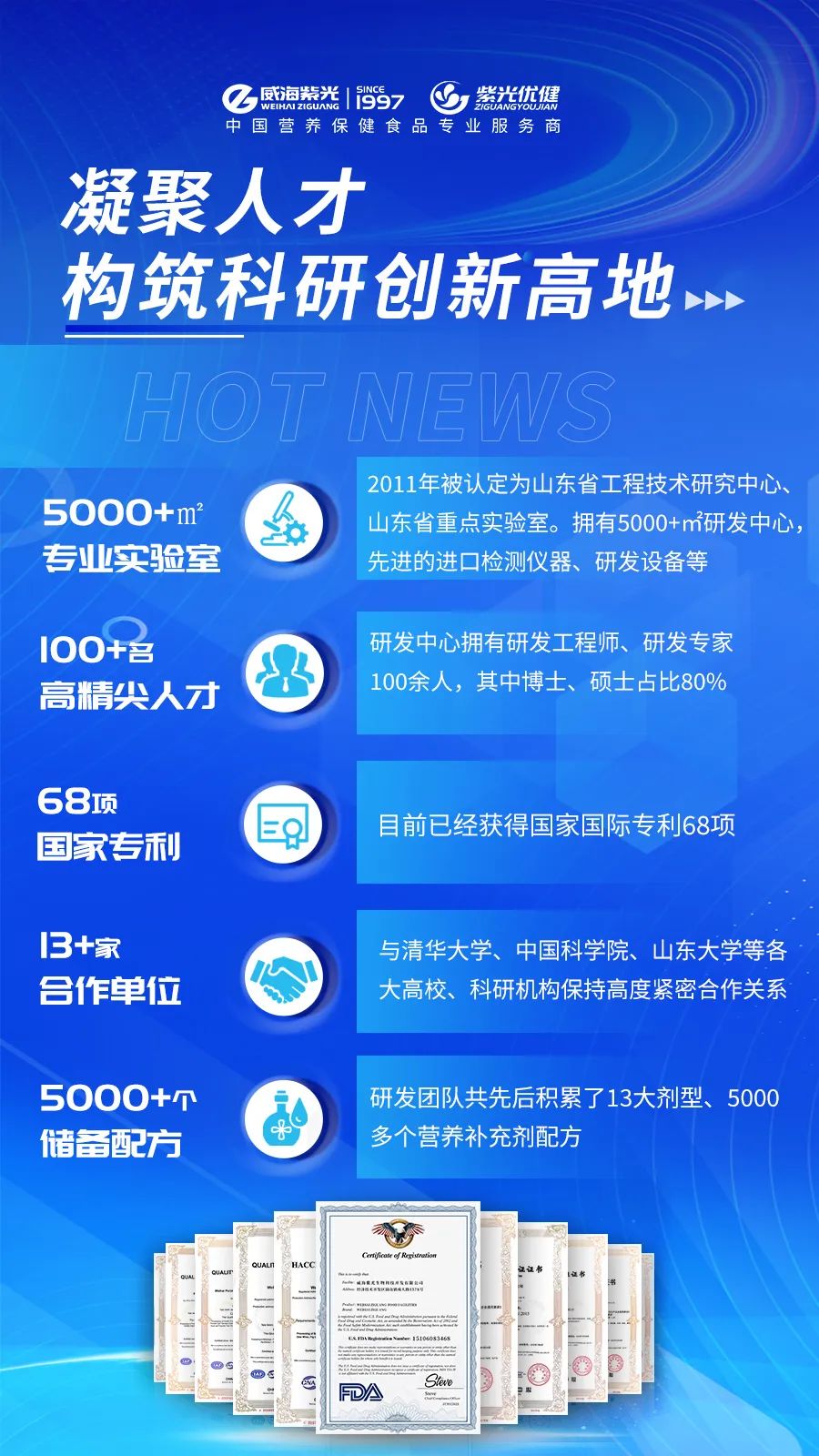 威海紫光研发团队是由一批具备丰富经验和专业背景的科研精英组成,目前,研发中心拥有研发工程师100余人,其中博士、硕士占比80%。2019年以来,研发中心承担国家、省级科技创新课题8项,取得国家级发明专利68项,已获得产品文号1000多个,2011 年威海紫光研发中心被认定为山东省工程技术研究中心、山东省重点实验室。
